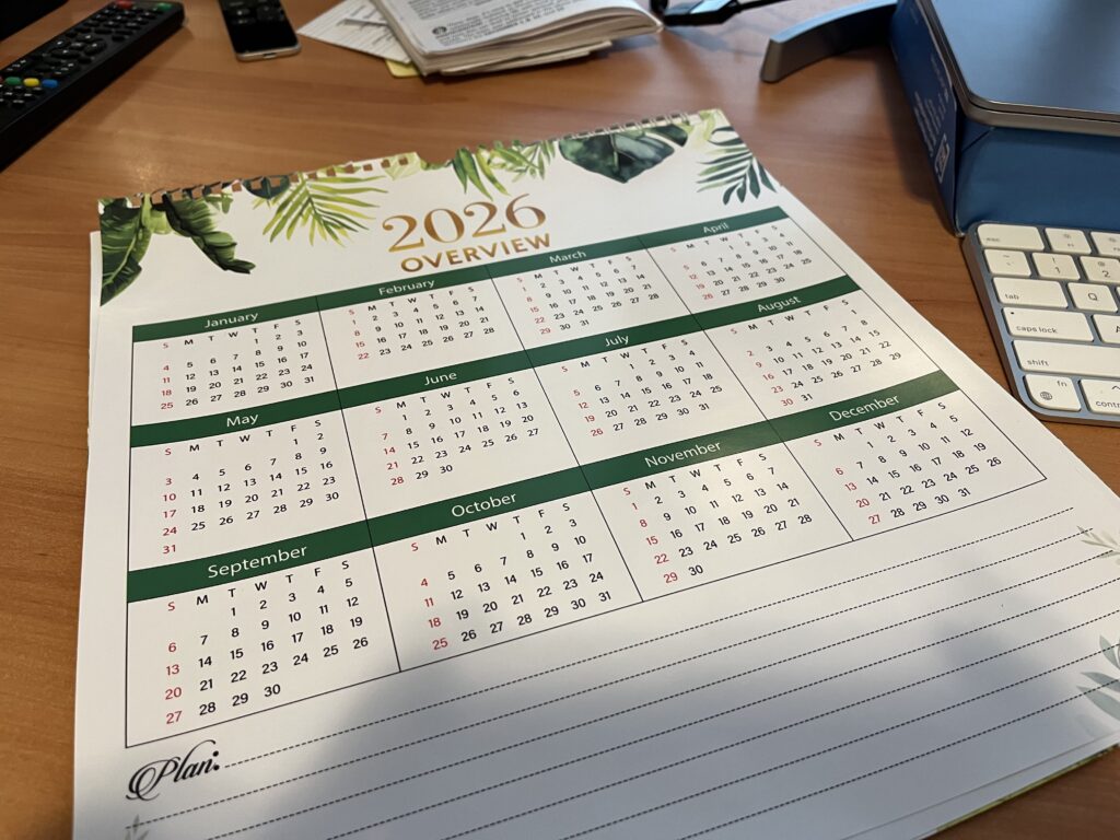 So far, 2026 looks plenty blank. I like fresh, new things. I’ve entered important birthdays but not the two vacations I’m still tweaking. The theme is ABIDE. I’m planning to paint a sign, like a quilt of patchwork, to commemorate my desire to conform in the presence of God. I’m not too old for change and found myself longing for a change of weather as I drove through the rain at an early hour to exercise with friends today. A friend in a southern state posted a dreamy photo of his little cottage bathed in early morning light. I experienced geographical envy. There will be many similar plans put on this new calendar. I’ve ordered 2026 like this, prioritizing; God, family/friends, sleep, eat well, exercise, and write. I wrote this down on a flight. Last year was a year of GO. I hope there was abiding but I was not in any spot long enough to feel any sort of rest. It was not a bad year but I’m tired. I’m hoping for rest and abiding. You may be wondering what happened to my fav goal of serving. It is still there but in a different context. That’s why abiding is first! I’ll post the painting when done.